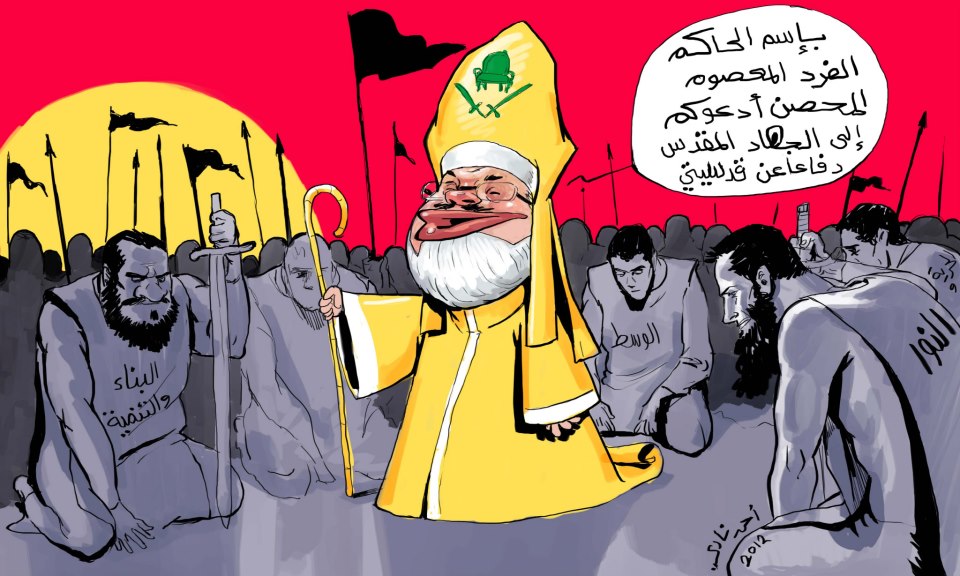 Morsi declaring to the MB and other Islamists: “In the name of the infallible, inerrant, and untouchable ruler. I call upon thee to prepare for a  holy ‘Jihad’ to protect my holiness”  (by Ahmed Nady)